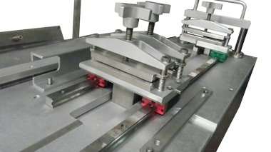 The operator installs the set up gage between one pair of sample clamps on a station. The sewn test sample is aligned and clamped into position.The set up gage is removed and installed on the second station. The second sample is aligned and clamped into position and the set up gage is removed. The desired number of test cycles is entered on the cycle counter and the test is started. Once this cycle count is reached the machine will automatically stop. Test samples are visually evaluated.
