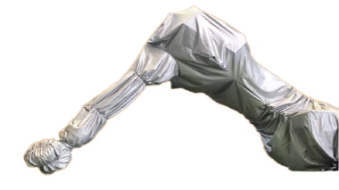 Pipeline suspension buckle and pendulum elastic belt:Pipeline suspension buckle is added around the arm to fix the pipeline in all directions. A ring of elastic belt is arranged on the hem to fix the protective clothing and prevent the pellets from entering the inside of the robot.